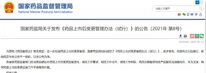 為貫徹《藥品管理法》有關規定,進一步加強藥品上市后變更管理,國家藥監局組織制定了《藥品上市后變更管理辦法(試行)》,現予發布,自發布之日起施行,此前規定與本公告不一致的,以本公告為準。